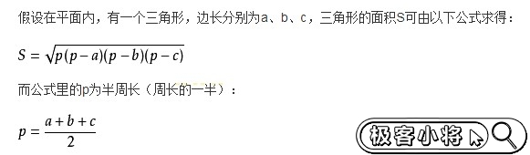 2、已知三條邊長度,計算三角形面積,海倫公式(S=√[p(p-a)(p-b)(p-c)],而公式里的p為半周長:p=(a+b+c)/2)