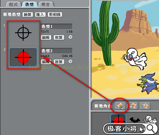 基礎課程都是簡單的步驟(程序)你可以完成一部作品,在進階課程中你必須更加關注更多的細節(jié)。這個高級課程使用whacka游戲讓孩子們練習1)自己設計背景2)自己設計鐵鎚3)打倉鼠的計分方法4)地鼠的出現和隱藏時間4-1設計背景、鐵鎚及地鼠先導入一個背景,老師打開的地方「Sports」