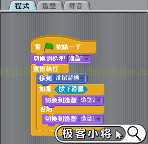 完成后測試程序,學生們會大吃一驚!真的跟著我的鼠標,按下之后,我會切換形狀。