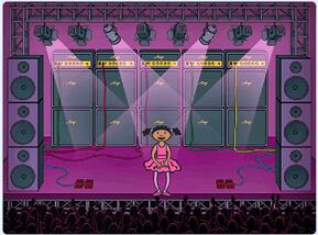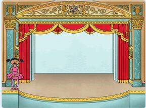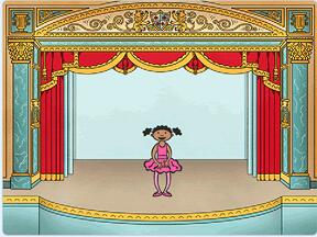 (1)點(diǎn)擊綠旗,角色Ballerina初始造型為ballerina-a,初始背景為T(mén)heater,初始位置在舞臺(tái)左側(cè);