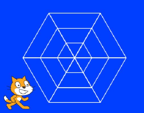 編程實(shí)現(xiàn):設(shè)臵舞臺(tái)背景為藍(lán)色,選擇畫筆為白色,粗細(xì) 2,坐標(biāo)(0,0)點(diǎn)為中心,繪制一 個(gè)如圖所示的蜘蛛網(wǎng)。它是三層結(jié)構(gòu),基本單元中最小的三角形邊長為 50,每向外延 伸一層,邊長增加 50。注意: 1、點(diǎn)擊綠旗,小貓能夠瞬間繪制出蜘蛛網(wǎng)圖案,中間不可停頓。 2