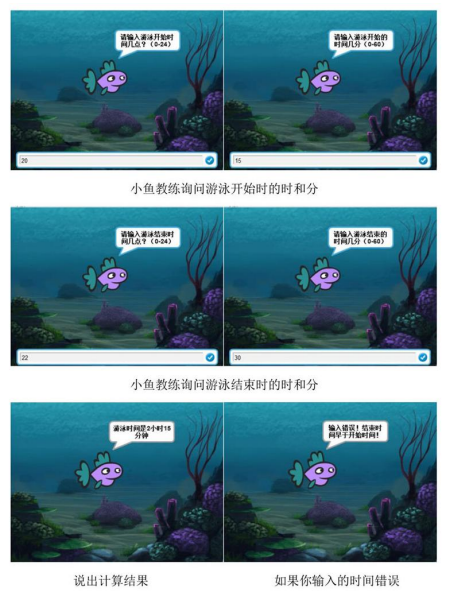 2、小魚教練計算并說出游了多長時間。但如果你輸入的結束時間早于開始時間, 小魚教練就會說“輸入錯誤!結束時間早于開始時間。”程序結束。