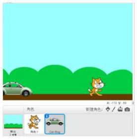 將舞臺背景改為如圖所示,在舞臺上設臵 1 個小車“Car-Bug”角色,并保留默 認的小貓角色。