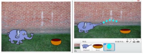 導(dǎo)入背景庫中的“brick wall2”和角色“Elephant”與“Bowl”和自己繪制的一 個藍(lán)色水珠。